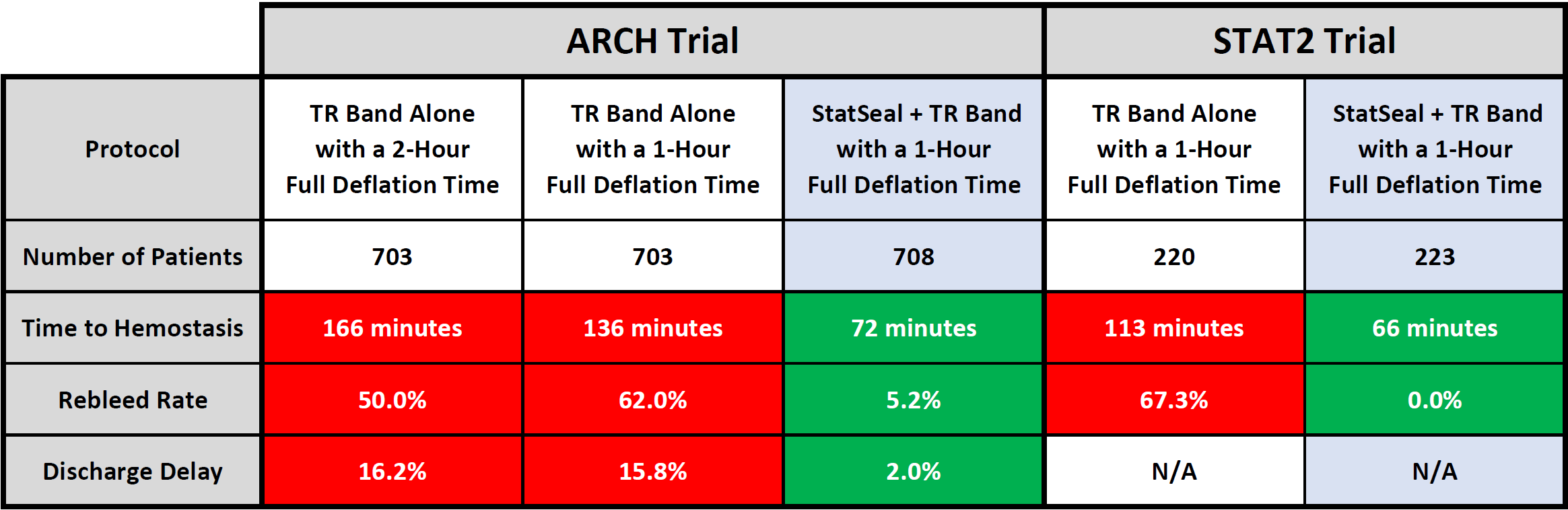 The very positive results from the ARCH Trial mirrored the results from the STAT2 Trial. These two synergistic randomized controlled trials cover two continents, four hospitals, and over 2,500 patients. As shown in the table below, the results clearly indicate significant clinical and operational benefits with StatSeal 1-hour protocols. These trials also demonstrate what happens without StatSeal use; more than 60% of cases rebleed after 1 hour and 50% still rebleed after 2 hours.2,3